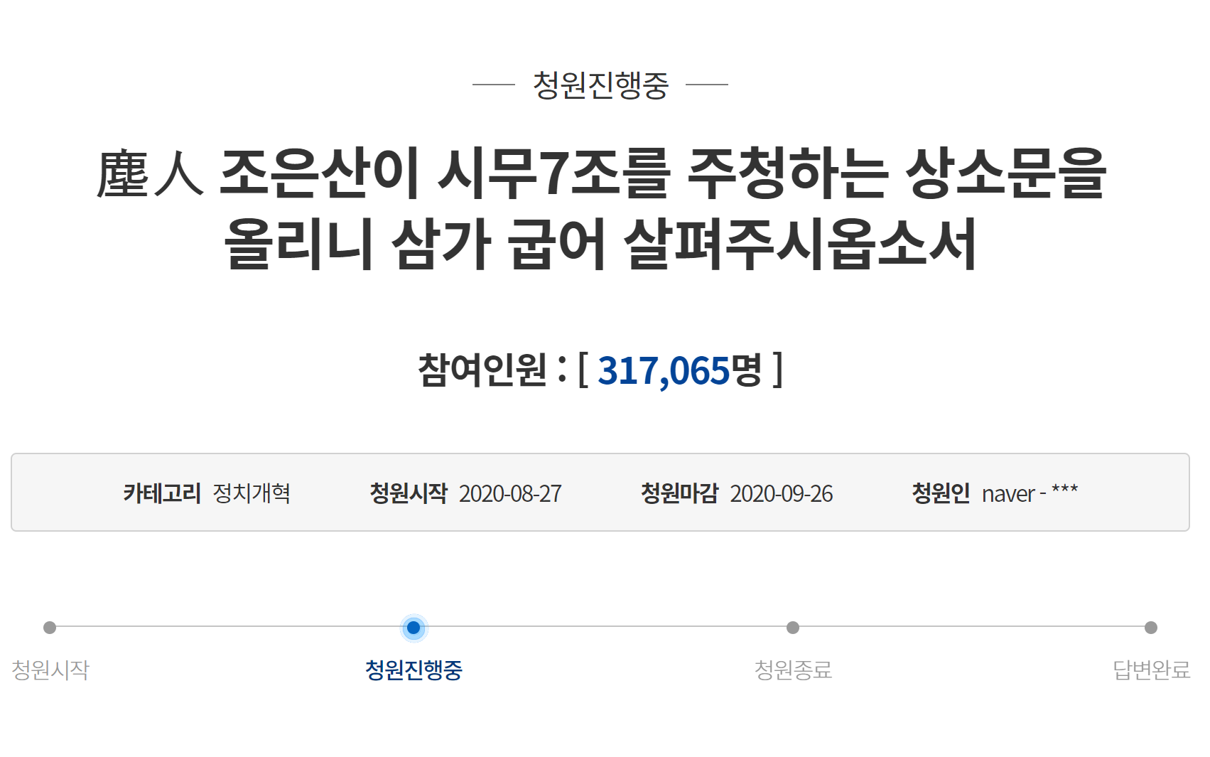 평가: 함부로 평가를 내릴 수 없는 부분이라 생각한다. 하지만 청와대 청원에 올라온 시무 7조를 한번쯤은 읽어볼 여지가 있다고 생각한다. 아래에 전문을 남긴다. 부디 한번쯤은 읽어 보기를 바란다. 그리고 옳고 그름을 판단하기 보다, 국민으로써 어떤 마음을 가지고 행동해야 하는지를 생각해 보면 좋겠다.